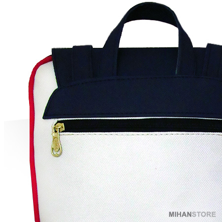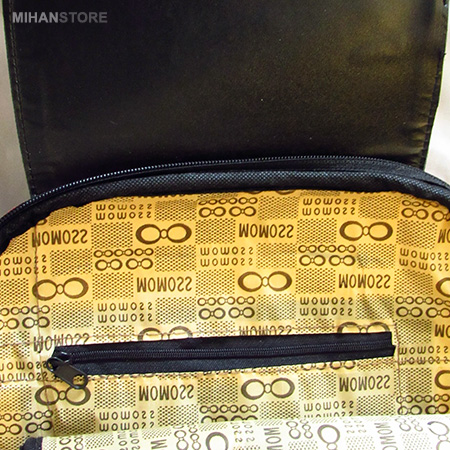 روی کیف با یک گیره طلایی رنگ تزئین شده است. یک زیپ پشت کیف قرار دارد که مناسب قرار دادن کارت های اعتباری و وسایل کم حجم مشابه می باشد. دارای یک بخش اصلی می باشد که با استفاده از زیپ یک طرفه باز و بسته می شود. در داخل و پشت کیف دو عدد جیب زیپ دار قرار دارد. داخل کیف با آستر طرح دار دوخته شده است. دارای دو بند دوشی و یک بند کوچک دستی می باشد. بندهای دوشی در بلندترین حالت خود دارای 100 سانتی متر ارتفاع می باشد که می توانید به دلخواه اندازه ی آن را تغییر دهید.