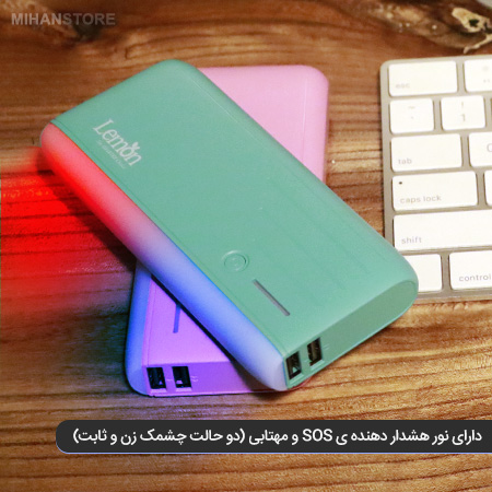 پاوربانک لمون 8000 با ظرفیت اسمی 8000 میلیآمپرساعت محصول برند «Lemon» است. این محصول با دو درگاه خروجی امکان شارژ همزمان دستگاههایتان را به شما میدهد. باتری این شارژر از نوع لیتیومی است و ولتاژ ورودی و خروجی این شارژر همراه 5 ولت است. بنابراین اگر دستگاههای 5 ولتی مانند گوشی، تبلت یا دوربین دیجیتال یا پخشکننده همراه دچار مشکل کمبود شارژ شد و به برق شهری یا خودرو دسترسی نداشتید، این پاور بانک مشکل شما را حل میکند. شدتجریان ورودی آن 1.2 آمپر است و درمجموع 2.1 آمپر میتوان از آن خروجی گرفت. با این شدتجریان 2.1 که برای تبلتها مناسب است، گوشیهای موبایل سریعتر از حالت معمولی شارژ میشوند. از روی نشانگر LED آن میتوان میزان شارژ باقیمانده را فهمید و یک چراغ LED بزرگ روی آن وجود دارد. این چراغ هم مانند چراغقوه عمل میکند هم میتواند حالت هشداردهنده SOS داشته باشد. علاوهبراین میتوانید چشمکزن قرمز و آبی را نیز فعال کنید. بدنهی آن از پلی کربنات و پلاستیک ABS ساختهشده است و جای خط و خش بهآسانی روی آن نمیافتد.