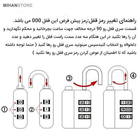 رمز پیش فرض این قفل 000 می باشد. قسمت سری قفل رو 90 درجه مخالف جهت ساعت بچرخانید و محکم نگهدارید و آن را رها نکنید در این هنگام سه عدد سمت راست قفل را تغییر دهید و عدد دلخوااه رو انتخاب کنید سپس میتونید سری قفل رو رها کنید (حتما توجه داشته باشید که تا اطمینان از عوض کردن رمز سری قفل رو رها نکنید)