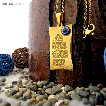 این گردنبند از استیل رنگ ثابت ساخته شده و دارای پلاک با آیه شریفه ی وان یکاد و چشم نظر خاص و زیبا می باشد. استفاده از گردنبندهای قرآنی برای دوری از چشم زخم، سحر و آسیب به مال و جان توصیه شده است. این گردنبند با سوره قرآنی، حس آرامش خوبی را به شما منتقل کرده و مناسب استفاده کودک تا بزرگسال است. گردنبند طرح مستطیل با وان یکاد و چشم نظر که از جنس استیل طلایی رنگ ثابت و ضد حساسیت می باشد و هیچ گونه حساسیتی برای پوست ایجاد نمی کند و با خیال آسوده از این گردنبند استفاده نمایید. این گردنبند یک زنجیر از مدل دیپلمات ساده طلایی با طول شصت سانتیمتر دارد که با قفل مدل قلاب محکم بسته می شود. این گردنبند می تواند مناسب آقایون ، بانوان و همچنین مناسب کودکان باشد.