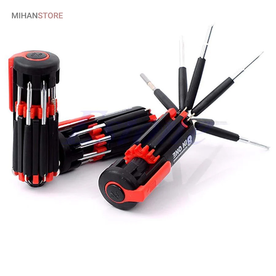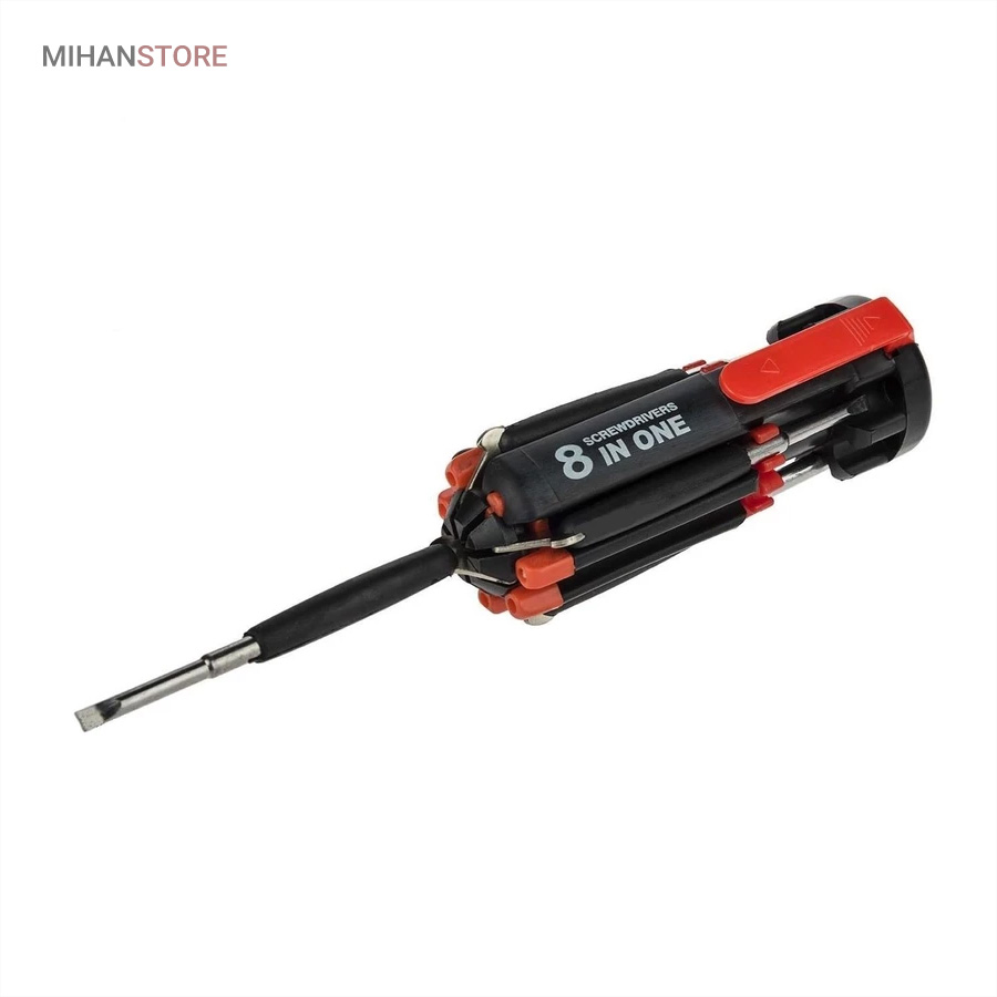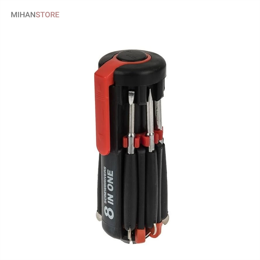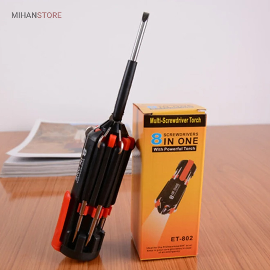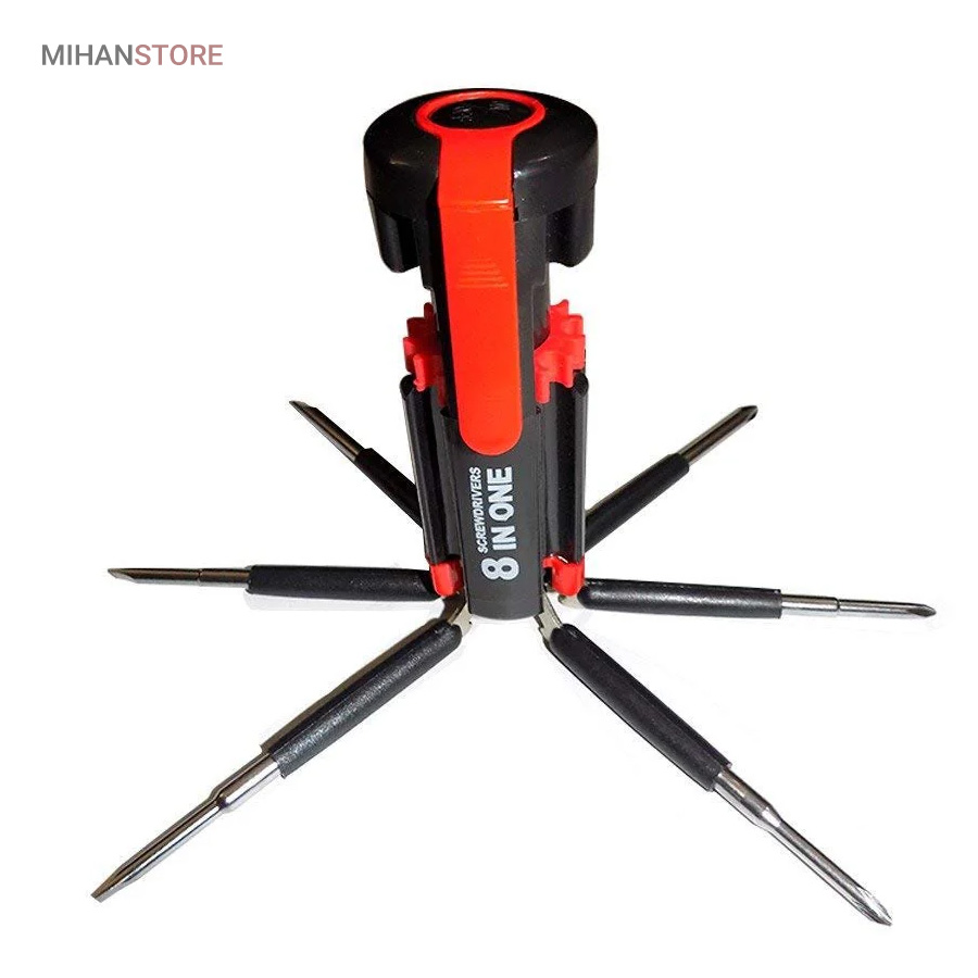 یک پیچ گوشتی به جای 8 پیچ گوشتی ، هشت پیچ گوشتی همه کاره . پیچ گوشتی چند کاره و چراغ دار . نوع درجه یک ، قابل استفاده داخل اتومبیل ، منزل و محل کار با 8 سر متفاوت مناسب برای تمام کارهای فنی . این پیچ گوشتی چراغ دار از جدید ترین و مناسب ترین پیچ گوشتی ها بوده که تابحال وارد بازار شده که به جای استفاده از 8 پیچ گوشتی شما می توانید از یک پیچ گوشتی 8 سر استفاده کنید.این پیچ گوشتی قابل حمل ، بدون نیاز به جعبه می باشد. پیچ گوشتی 8 سر جادویی چراغ دار قابل استفاده در محیطهای تاریک.پیچ گوشتی چند کاره و چراغ دار به همراه چراغ قوه برای کار کردن در محیط های تاریک نیز مناسب می باشد.