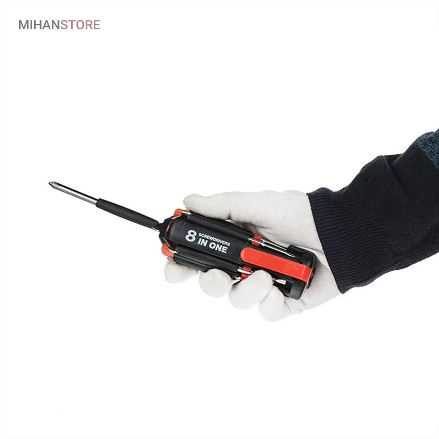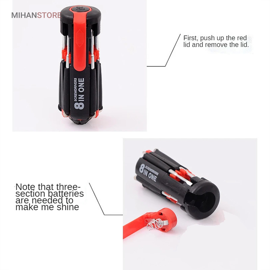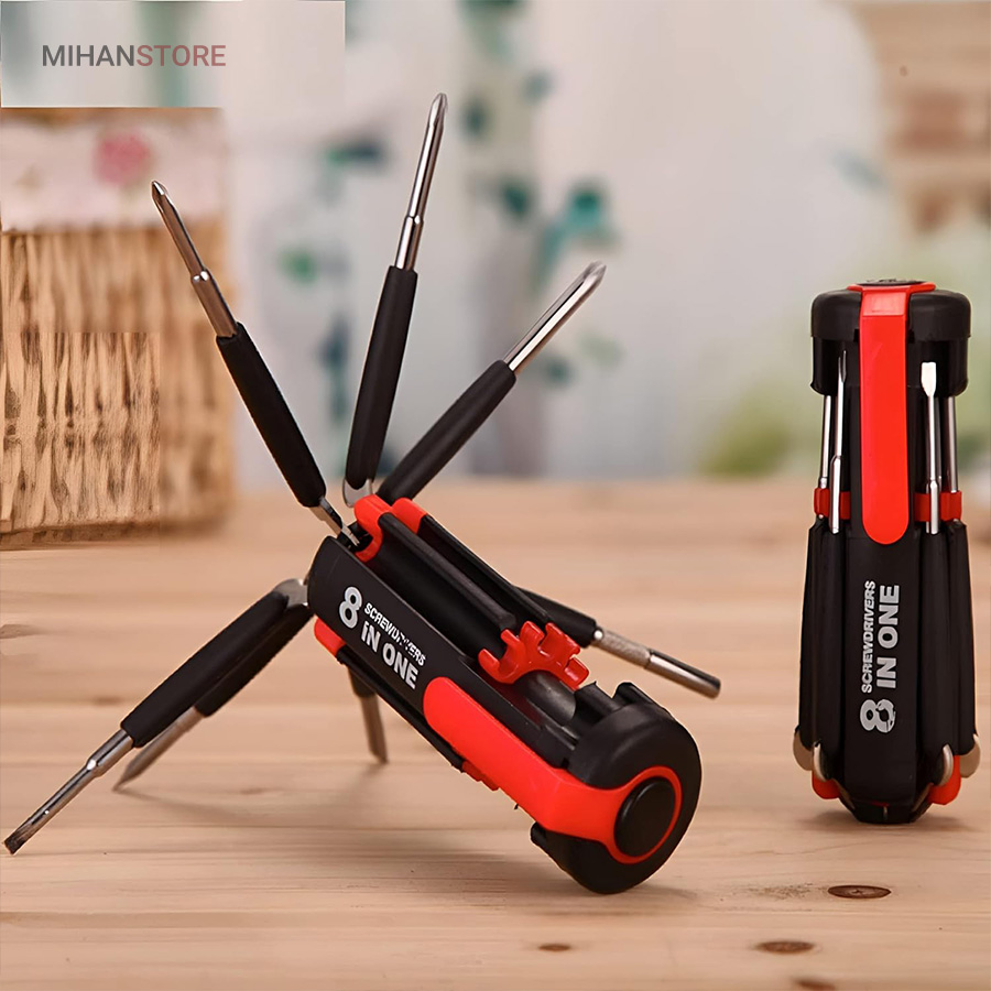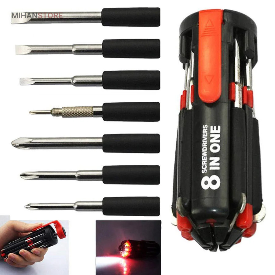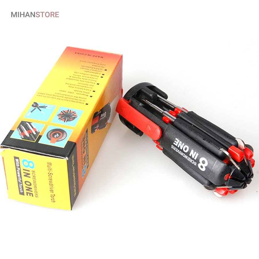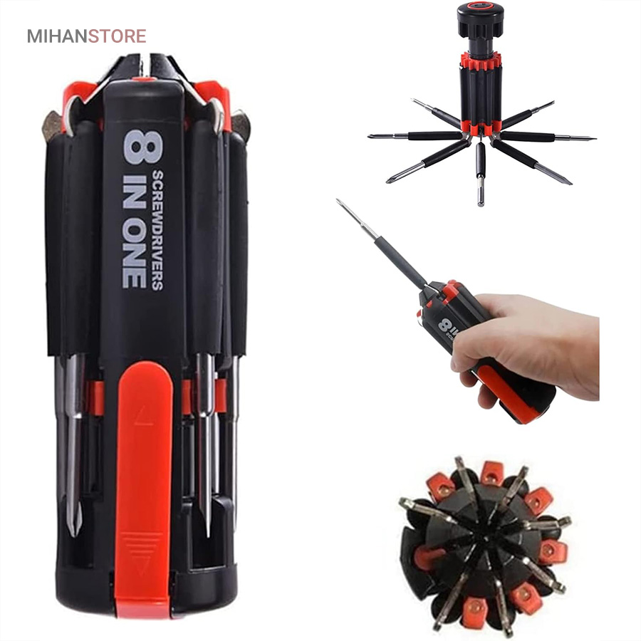 یک پیچ گوشتی به جای 8 پیچ گوشتی ، هشت پیچ گوشتی همه کاره . پیچ گوشتی چند کاره و چراغ دار . نوع درجه یک ، قابل استفاده داخل اتومبیل ، منزل و محل کار با 8 سر متفاوت مناسب برای تمام کارهای فنی . این پیچ گوشتی چراغ دار از جدید ترین و مناسب ترین پیچ گوشتی ها بوده که تابحال وارد بازار شده که به جای استفاده از 8 پیچ گوشتی شما می توانید از یک پیچ گوشتی 8 سر استفاده کنید.این پیچ گوشتی قابل حمل ، بدون نیاز به جعبه می باشد. پیچ گوشتی 8 سر جادویی چراغ دار قابل استفاده در محیطهای تاریک.پیچ گوشتی چند کاره و چراغ دار به همراه چراغ قوه برای کار کردن در محیط های تاریک نیز مناسب می باشد.