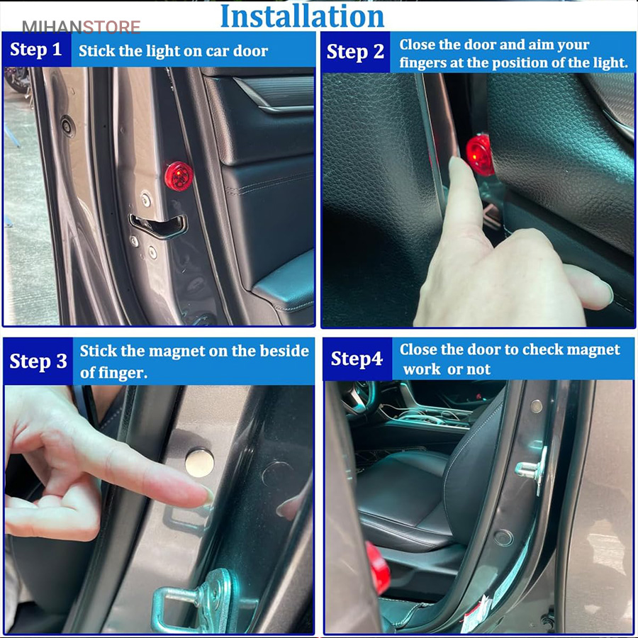 آموزش نصب: ابتدا باید چراغ را روی قسمت درب خودرو با استفاده از چسبی که روی چراغ تعبیه شده است نصب کنید که زمانی که درب خودرو باز شود این چراغ به طور کامل دیده شود. همراه چراغ ها دو عدد صفحه مغناطیسی نیز ارائه شده است که این صفحه ها باید لای بدنه خودرو به گونهای نصب گردد که زمانی که درب خودرو بسته می شود، دقیقاً چراغ مقابل صفحه مغناطیسی قرار بگیرد.