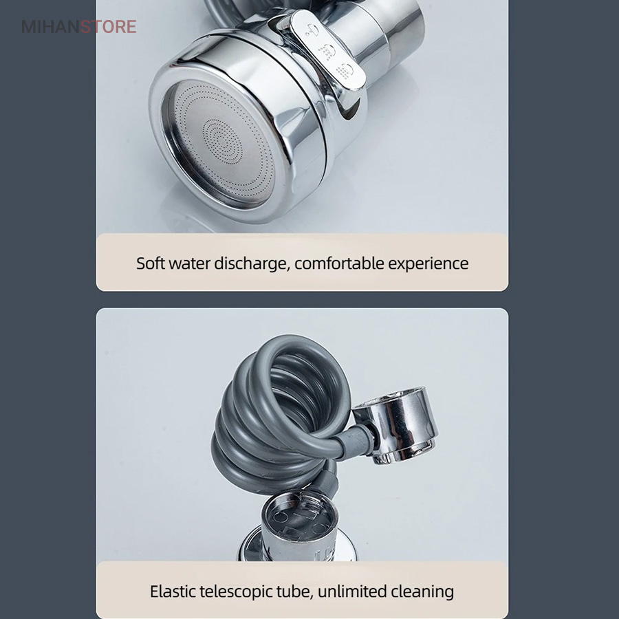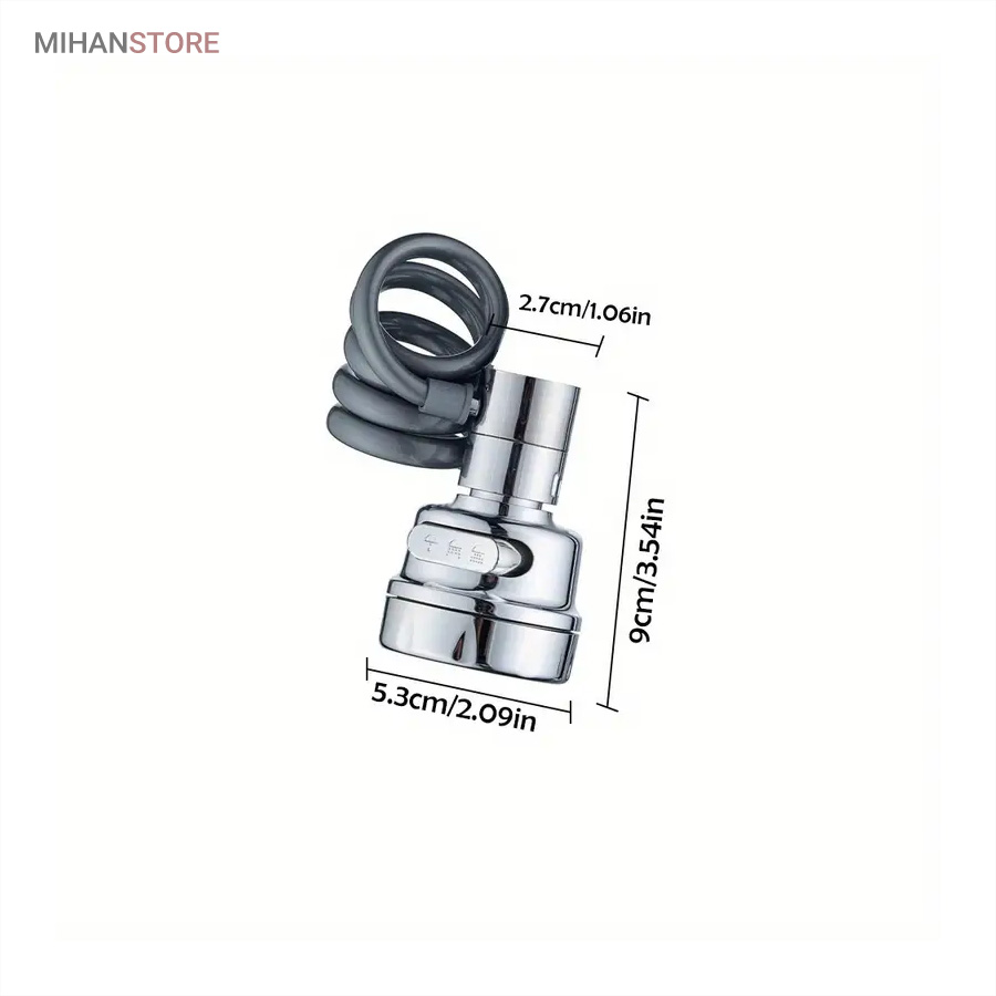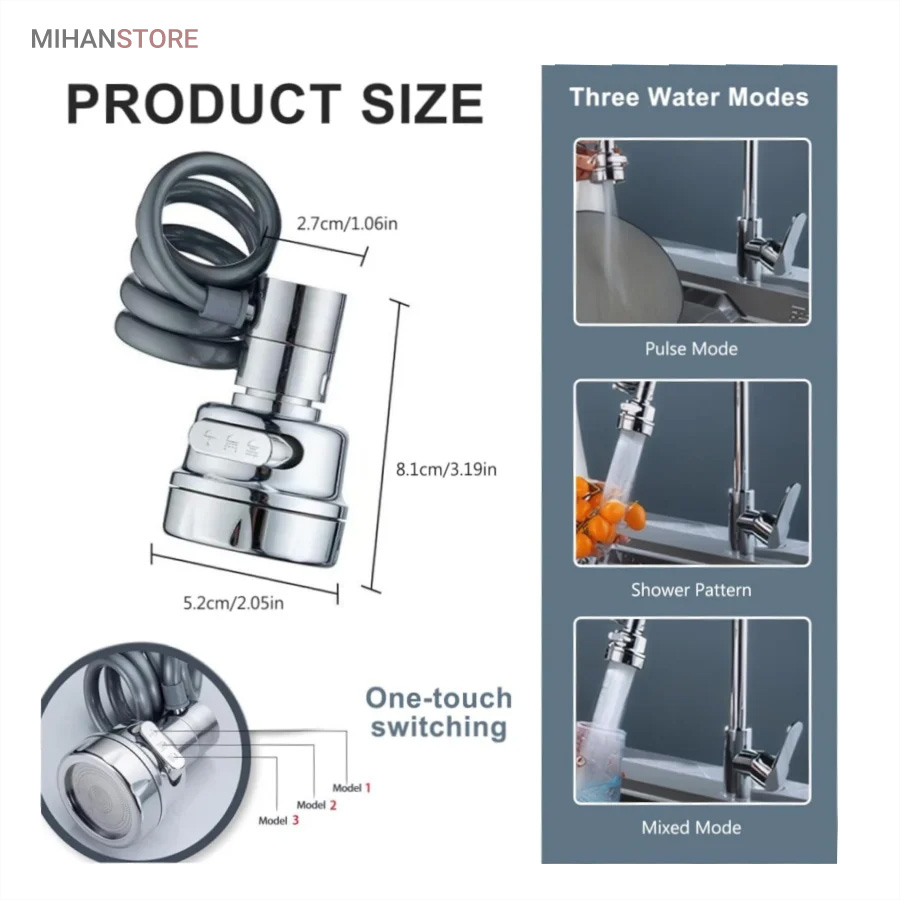 با قابلیت چرخش وسیع 360 درجه به وسیله شلنگ فنری و مجهز به 3 حالت پخش آب، قادر است بطور کامل در تمام جهات بچرخد، تا به هر نقطهای از سینک یا روشویی دسترسی پیدا کند و امکان شستشوی راحت را بدهد. این سر شیر آب، با استفاده از ترکیبی از مواد باکیفیت و پلاستیک ABS، عمر طولانی و دوام بینظیری دارد. نکته: سایز قطر این سری شیر آب برای تمامی شیرهای روشویی و آشپزخانه رایج بازار ایران مناسب میباشد. با باز کردن صفحه استیل سری شیر امکان تمیزکردن آن میسر می شود.