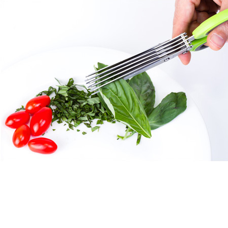 اين قیچی عجيب و غريب شامل 10 تيغه تيز است كه اين امكان را براي شما فراهم مي كند تا سبزيجات، کاهو، پیاز و ... را با سرعت بالا و در تکه های مساوی برش داده و خرد كنيد. جنس دسته به نوعی طراحی شده است که مانع از سر خردن قیچی می شود و همچنین جنس تیغه های آن استیل بوده و فوق العاده با کیفیت می باشد. یکی از مشکلات این قیچی تمیز کردن بین تیغه های آن می باشد که در طراحی جدید این محصول این مشکل هم حل شده است و در کنار قیچی یک قطعه محافظ و تمیز کننده قرار داده شده است که این تمیز کننده با استفاده از شیار هایی که دارد بین تیغه ها قرار می گیرد و سطح تیغه ها را تمیز می کند.