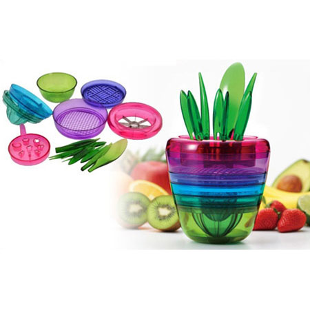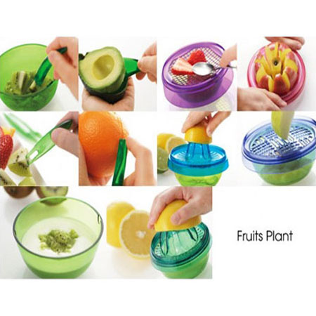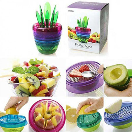 گلدان جادویی Fruits Plant یک محصول بسیار کابردی است که دارای طراحی عالی و هوشمندانه ای می باشد. این محصول 10 کابرد مختلف دارد که از کاربرد های آن می توان به: آبگیر لیمو، قاچ کن سیب، صفحه برش توری، رنده توری شکل، آبگیر گریپفروت و ... اشاره کرد. جالب است بدانید برگ های این گلدان هم کاربرد های مختلف دارد! 2 برگ برای برش لیمو و 4 برگ کوچک بعنوان چنگال طراحی شده اند. این گلدان هم یک دکوری فانتزی و شیک برای آشپزخانه شما می باشد و هم یک وسیله 10 کاره بسیار کاربردی!