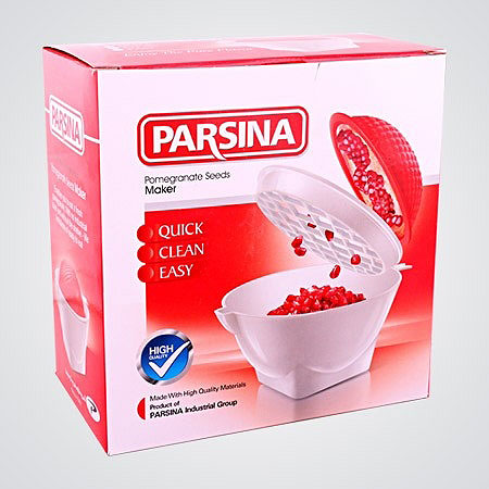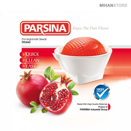 از آنجا که دون کردن دانه های انار کار تقریبا دشوار و زمان بریست انار دون کن پارسینا به کمک شما آمده است تا بتوانید به وسیله آن انار را به راحتی دون کنید و با آن انواع نوشیدنی ،دسر ،بستنی و ... تهیه کنید. فقط کافیست انار را از وسط نصف کرده و بر روی پارسینا قرار دهید و درب آن را ببندید و با پشت قاشق بر روی آن ضربه بزنید. دانه های انار به راحتی جدا شده و درون کاسه ریخته می شوند.