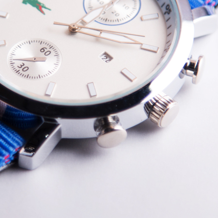 الگو برداری این ساعت از تسمه ی مشهور ناتو می باشد که با ترکیب خطوط رنگ ها و ادغام آن ها با یکدیگر بندی زیبا و شیک ارائه کرده است. برای اولین بار تسمه ناتو در نیروی دریایی بریتانیا استفاده شد که دلیل اصلی تولید و استفاده از آن زنگ نزدن بند ساعت برای آن دسته از غواصانی بود که مدام در حال شنا کردن بوده و به گذر زمان توجه خاصی داشته اند، از این رو برای جلوگیری از زنگ زدن بند ساعت ها و همچنین داشتن ظاهری انعطاف پذیر که به آن ها کمک کند از تسمه ی ناتو استفاده میکردند. بعد از مدتی برند لاگوست نیز با الهام از آنان شروع به تولید گسترده ی ساعت ها با چنین بندهایی کرد.